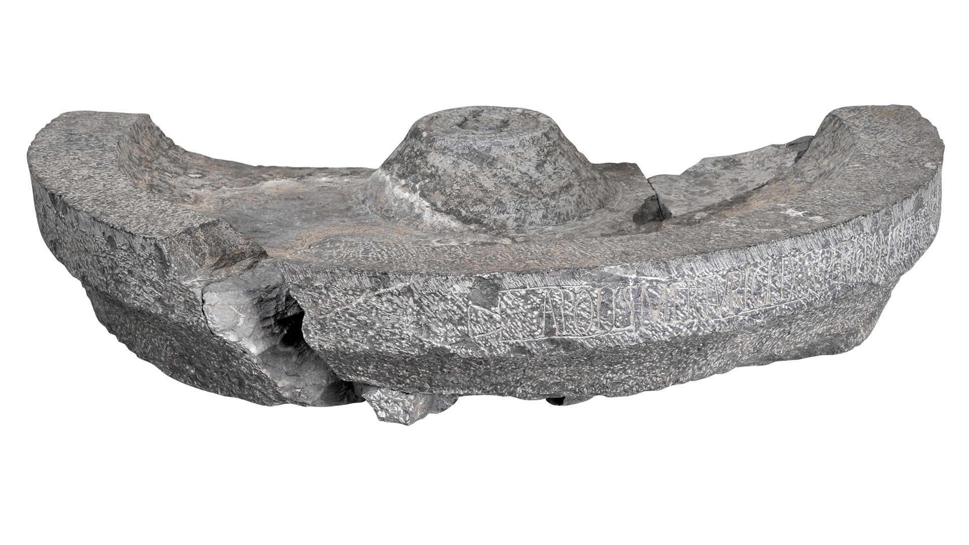 Die Widmungsinschrift Apoll(ini) Smerturici Exsuper Mansueti f(ilius), die in einer tabula ansata (von Schwalbenschwänzen flankierte Kartusche) angeordnet ist, ist von großem Interesse, da sie uns den Namen der Schutzgottheit des Heiligtums verrät: Apollon, der in seiner lokalen Form (Smerturix bedeutet "der Versorger, der Beschützer") als Heil- oder Reinigungsgott verehrt wurde, und wir erfahren den Namen des Widmungsträgers, eines Peregriners (freier Bewohner ohne römisches Bürgerrecht) namens Exsuper, Sohn des Mansuetus.