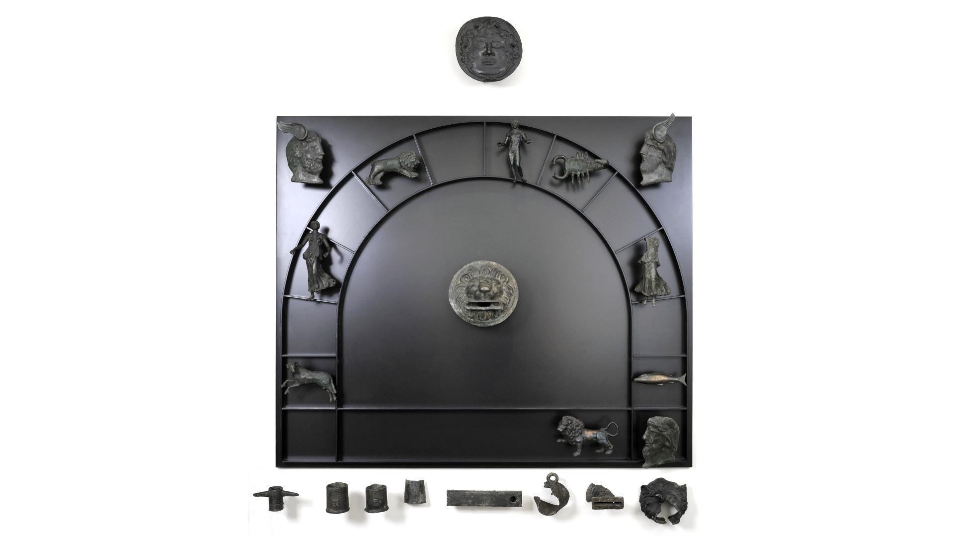 Cet ensemble de vingt pièces datées de la fin du 2e ou du début du 3e siècle après J.-C. comprend des éléments d’adduction d’eau (une clef de fontaine, deux déversoirs à masque léonin, trois bagues de raccordement de conduites et un tuyau quadrangulaire perforé) ainsi que des appliques figuratives qui ont dû servir à l’origine dans le speleum d’un mithréum. Comme le culte de Mithra s’était surtout implémenté en milieu urbain, le lieu de provenance originel de ces objets est sans doute à chercher ailleurs, peut-être à Theux-Juslenville (Liège), dans une agglomération ayant vraisemblablement eu le statut de vicus, où l’on a identifié en 1557 deux autels de Mithra aujourd’hui perdus.