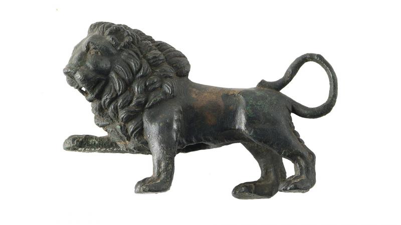 De tels motifs – à l’exception de la Gorgone Méduse, rarement figurée en contexte mithriaque – se retrouvent dans le décor sculpté des bas-reliefs mithriaques rhénans en pierre (celui du mithréum I de Nida-Heddernheim, par exemple), où ils encadrent une composition centrale figurant Mithra tauroctone. Le lion plastique, levant la patte antérieure droite, et le col tronconique d’un vase évoquent, quant à eux, une scène qui figure souvent sous la tauroctonie et associe un serpent, ici manquant, à un cratère et un lion.