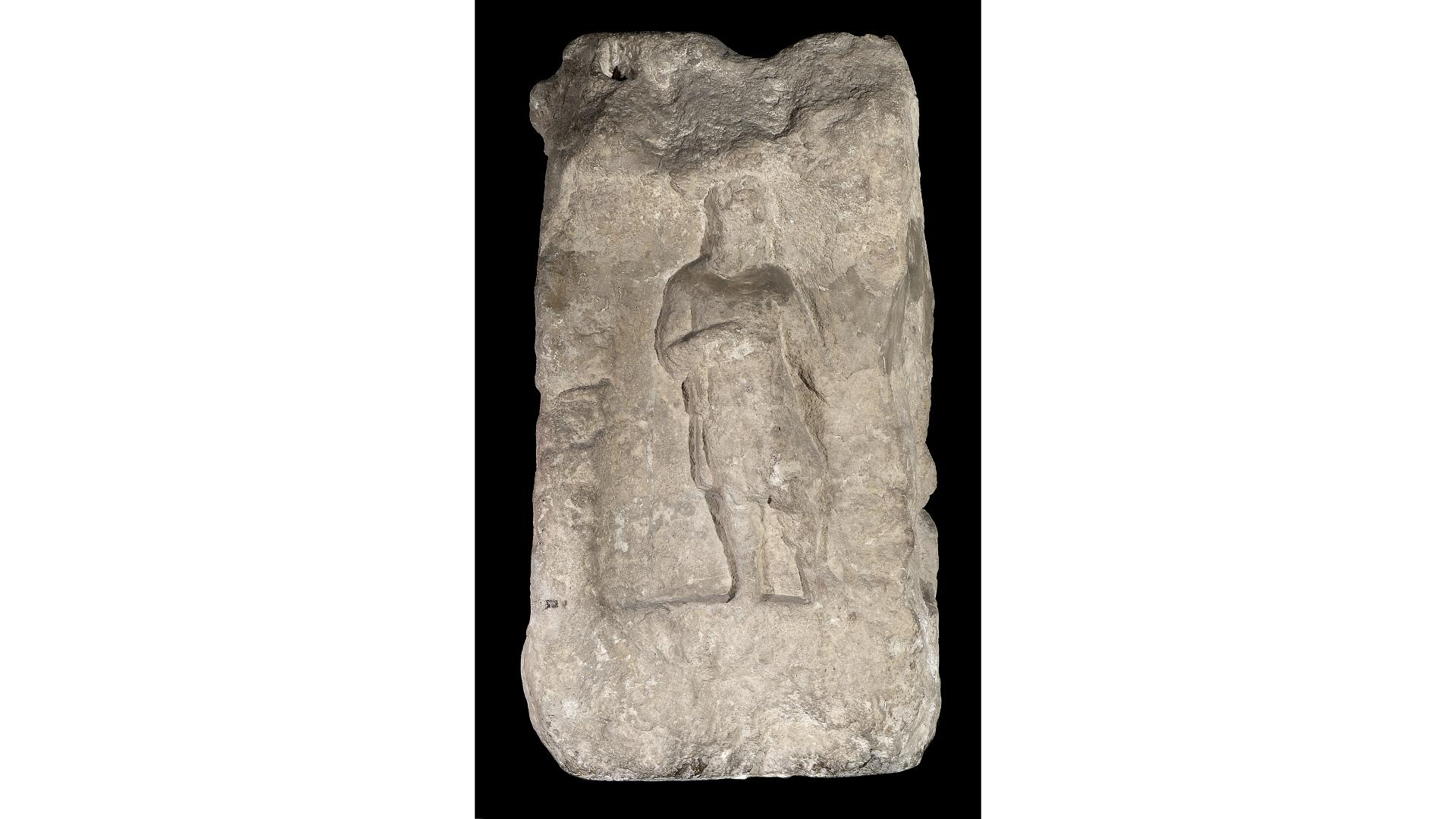 La troisième face du piédestal représente un personnage vêtu d’un manteau court, sans attributs divins. Il s’agit selon toute vraisemblance de Mercure, le messager des dieux, dieu du commerce et du voyage qui apparaît fréquemment sur ce type de monument sculpté. La main gauche alignée le long du corps tenait probablement un caducée ; la main droite repliée sur la poitrine maintenait peut-être une bourse. La quatrième figuration sculptée, très altérée, reste hypothétique. Il pourrait s’agir du dieu Hercule, traditionnellement représenté nu, la dépouille du lion de Némée déployée sur l’épaule gauche, la main droite s’appuyant sur une massue. Une frise gravée d’une inscription dédicatoire illisible couronne ce socle historié.