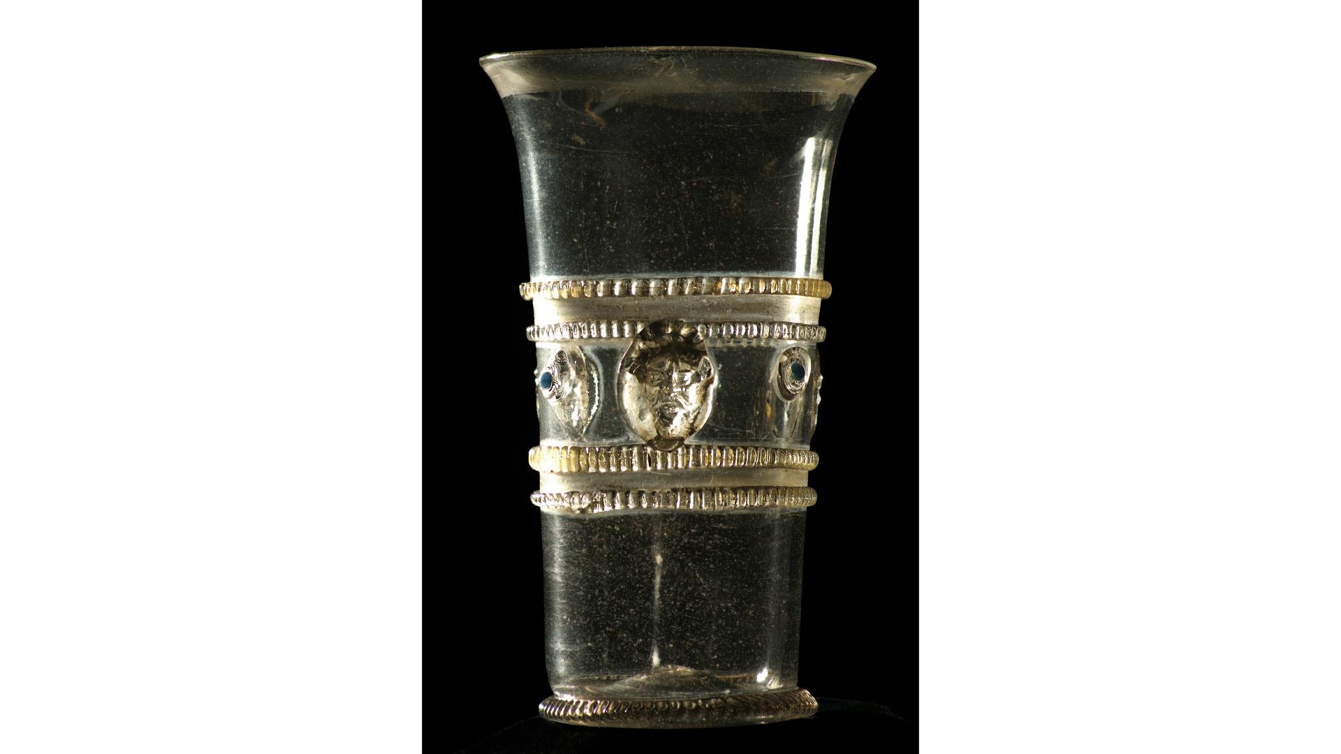 Ces pièces ont été réalisées en verre fougère, ainsi dénommé car ce sont des cendres de fougère qui constituent la potasse, servant de fondant destiné à abaisser la température de fusion du verre. Elles portent un décor typiquement anversois, constitué de mascarons à tête de Neptune, dorés à l’origine, alternant avec des rosaces serties d’une perle turquoise. La forme du gobelet bas évasé (dénommé berkemeyer) dérive du roemer ou verre à vin du Rhin du 16ᵉ siècle, dont le fût est décoré de pastillages pointus. Des cordons pincés à la roulette ornent la base des gobelets ainsi que le corps de ceux-ci et de la canette. La lèvre des gobelets est bordée d’un bandeau doré. Deux bandes en relief, dorées à l’origine, décorent la cloche, dont le grelot a été remplacé par un battant en verre. Les rubans pincés ainsi que les bandeaux dorés sont des ornements à la façon de Venise. Le couvercle en argent de la canette est gravé d’une Vierge et un buste d’homme en armure, coiffé d’un casque et armé d’un sabre sert de poucier.
