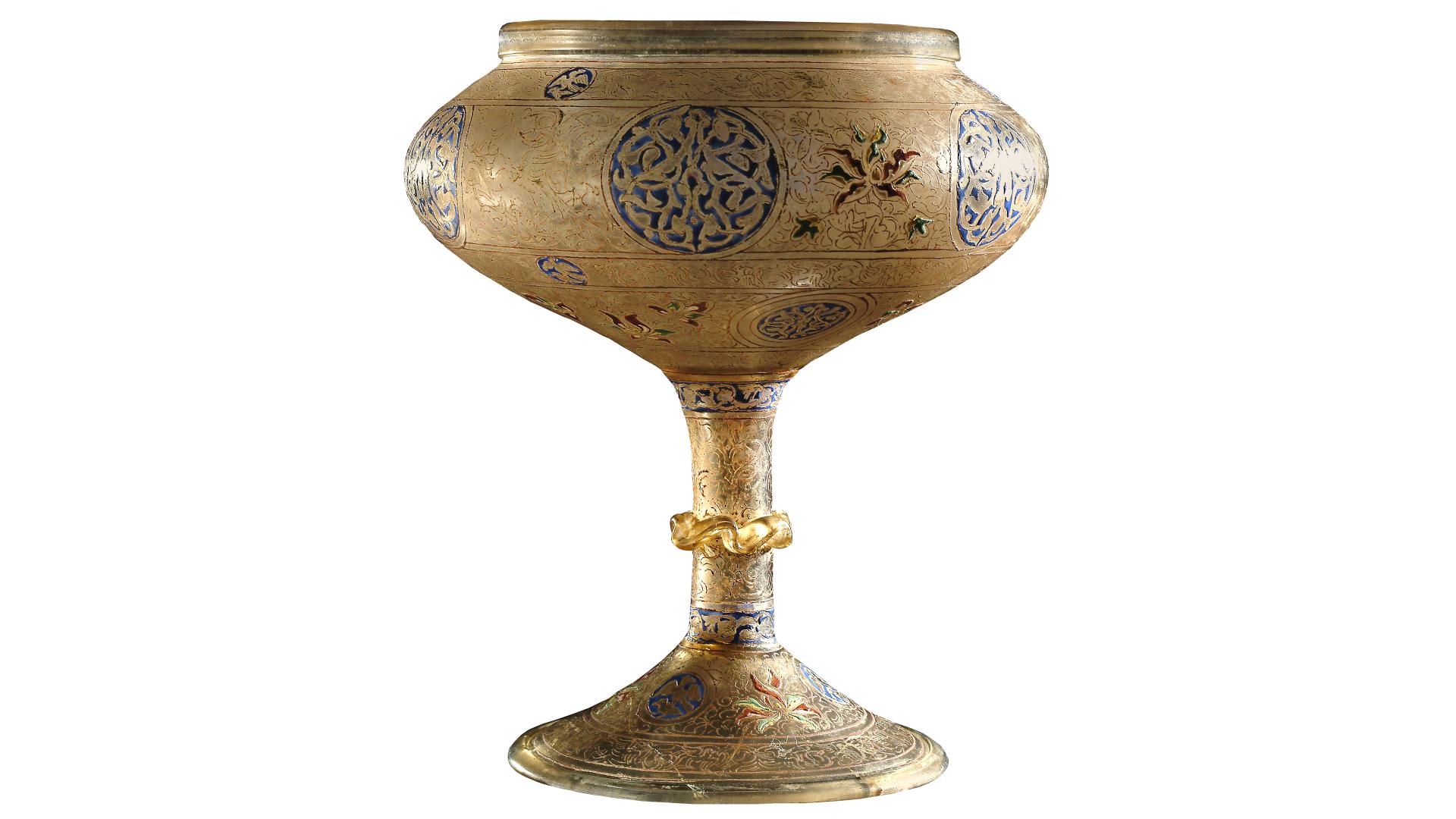 Cette coupe impressionnante porte un décor émaillé déroulé en cinq registres. Le bandeau principal est compris entre deux frises d’oiseaux en vol au milieu d’entrelacs végétaux et trois cercles au rapace enserrant une proie. Il comporte six grands médaillons aux rinceaux entremêlés sur fond bleu, séparés en alternance par trois fleurs colorées et trois zones d’arabesques où évoluent de grands oiseaux. La dernière frise comporte trois grands disques de rinceaux sur fond bleu, alternant avec trois fleurs émaillées, sur fond d’arabesques. Les zones réservées à fond bleu agrémentées de rinceaux décorent régulièrement des pièces dorées islamiques.