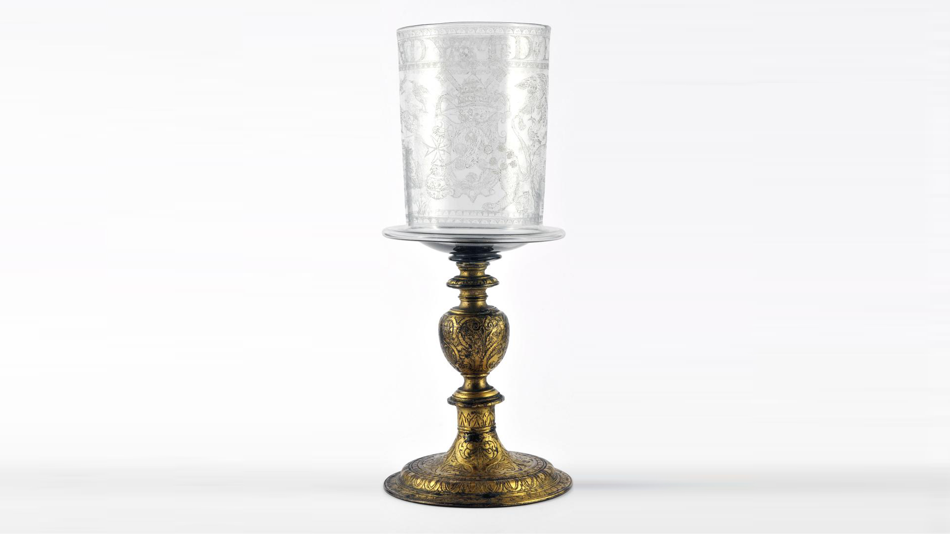 Ce décor animalier constituant un véritable bestiaire illustré est exceptionnel et très rarement gravé à Venise. De plus, sont mentionnés dans un inventaire de la garde-robe de Ferdinand Ier de Médicis, réalisé en 1587, 4 bassins en verre ornés d’animaux, ce qui orienterait une production florentine de ce gobelet unique. Il fut transformé en ciboire au 19ᵉ siècle, le pied en verre originel remplacé par du laiton doré.